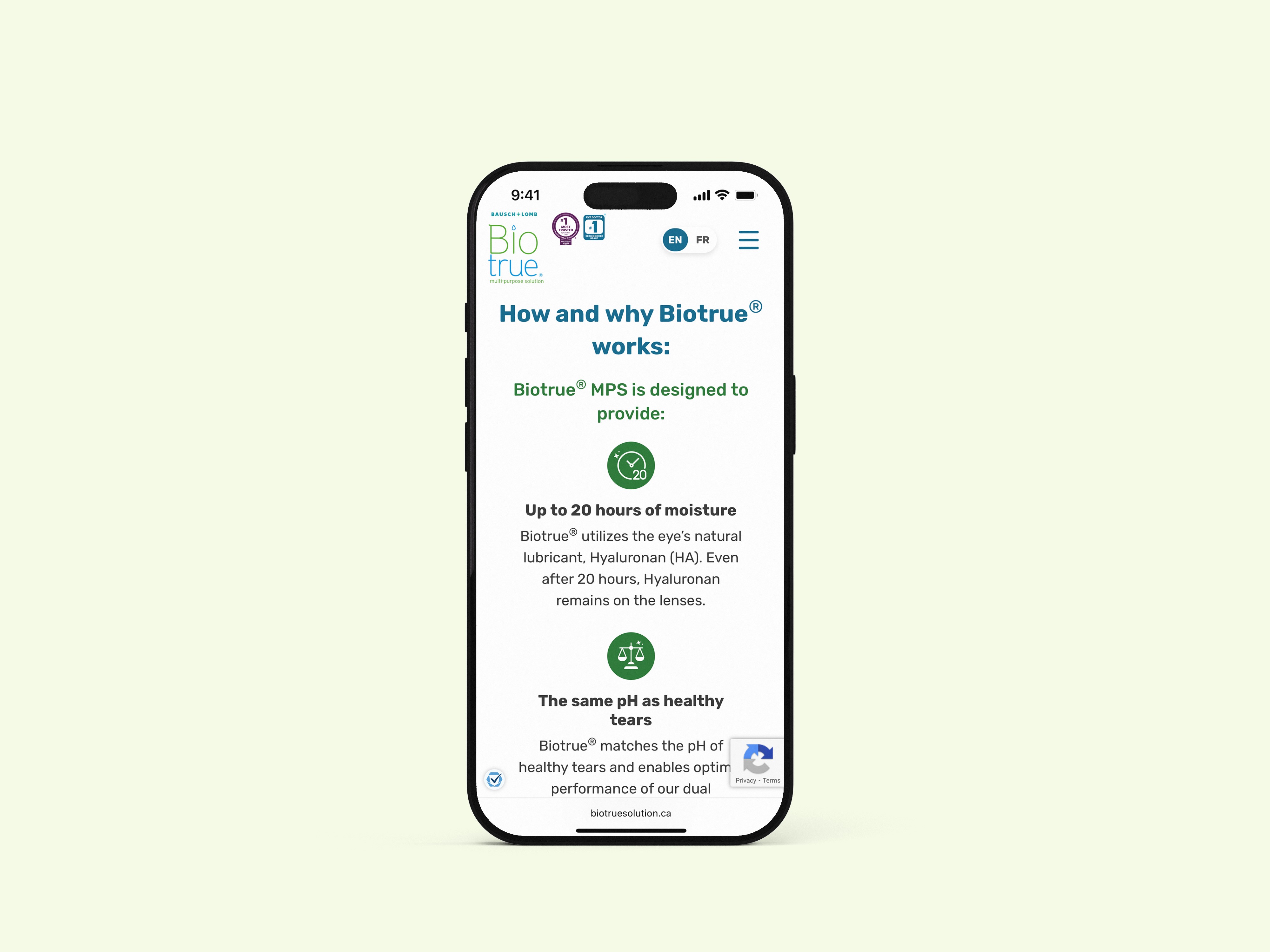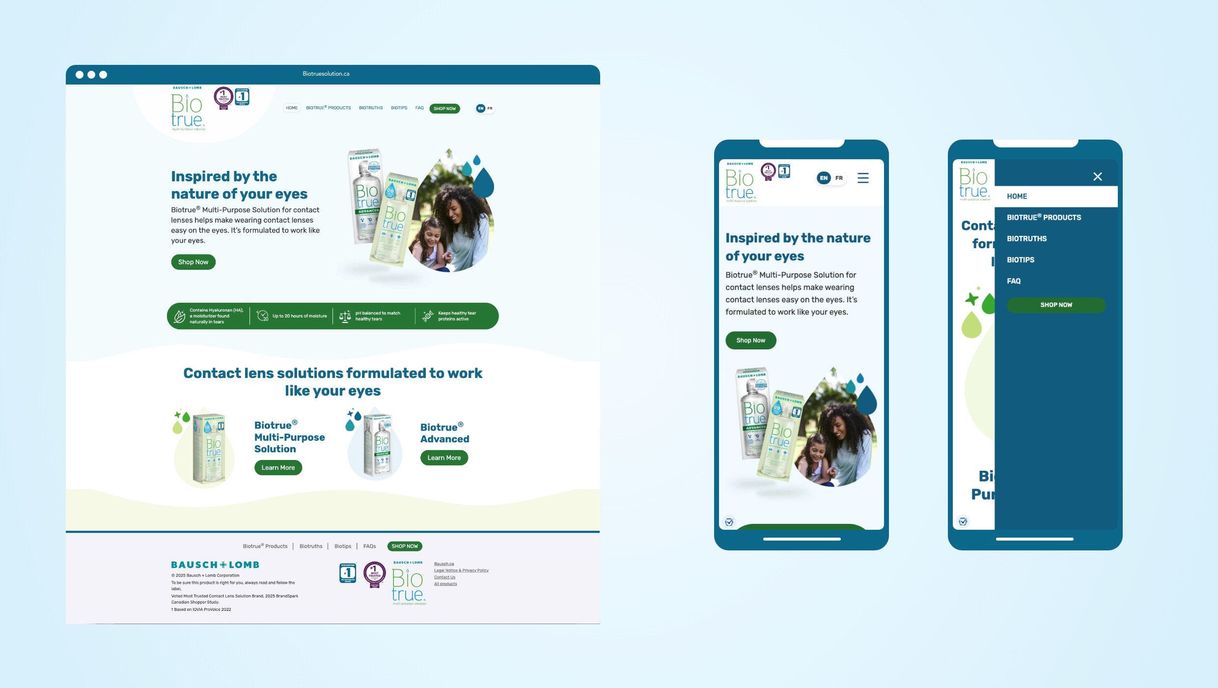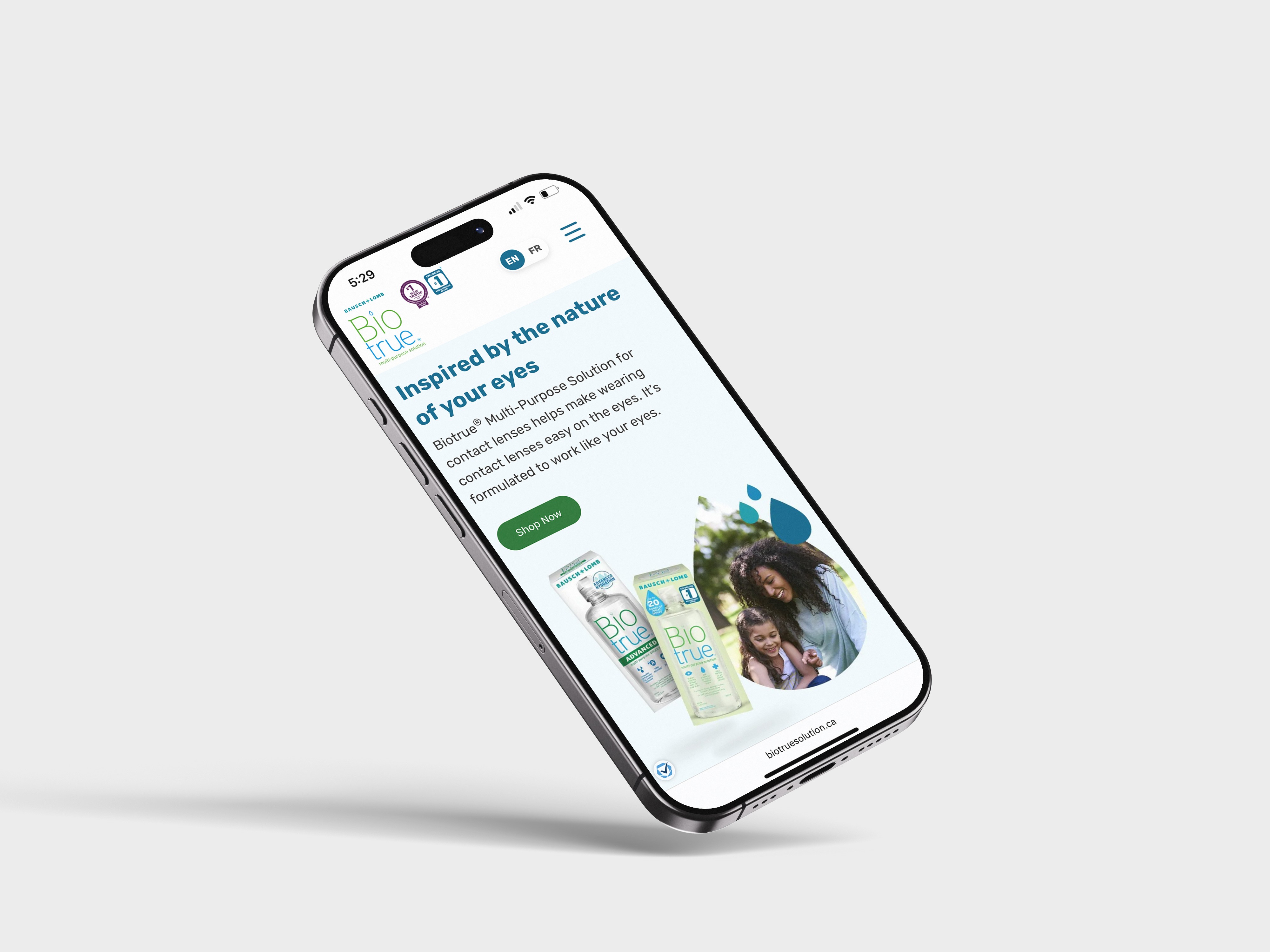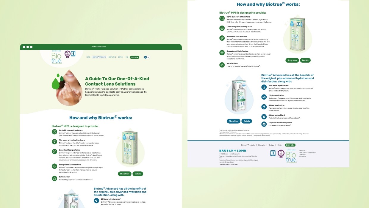 For Biotrue Solution’s Canadian website, I designed and built a fully refreshed digital experience that brought the brand’s identity to life. The goal was to create a modern, intuitive site that educated consumers, highlighted key product benefits, and optimized the path to conversion.